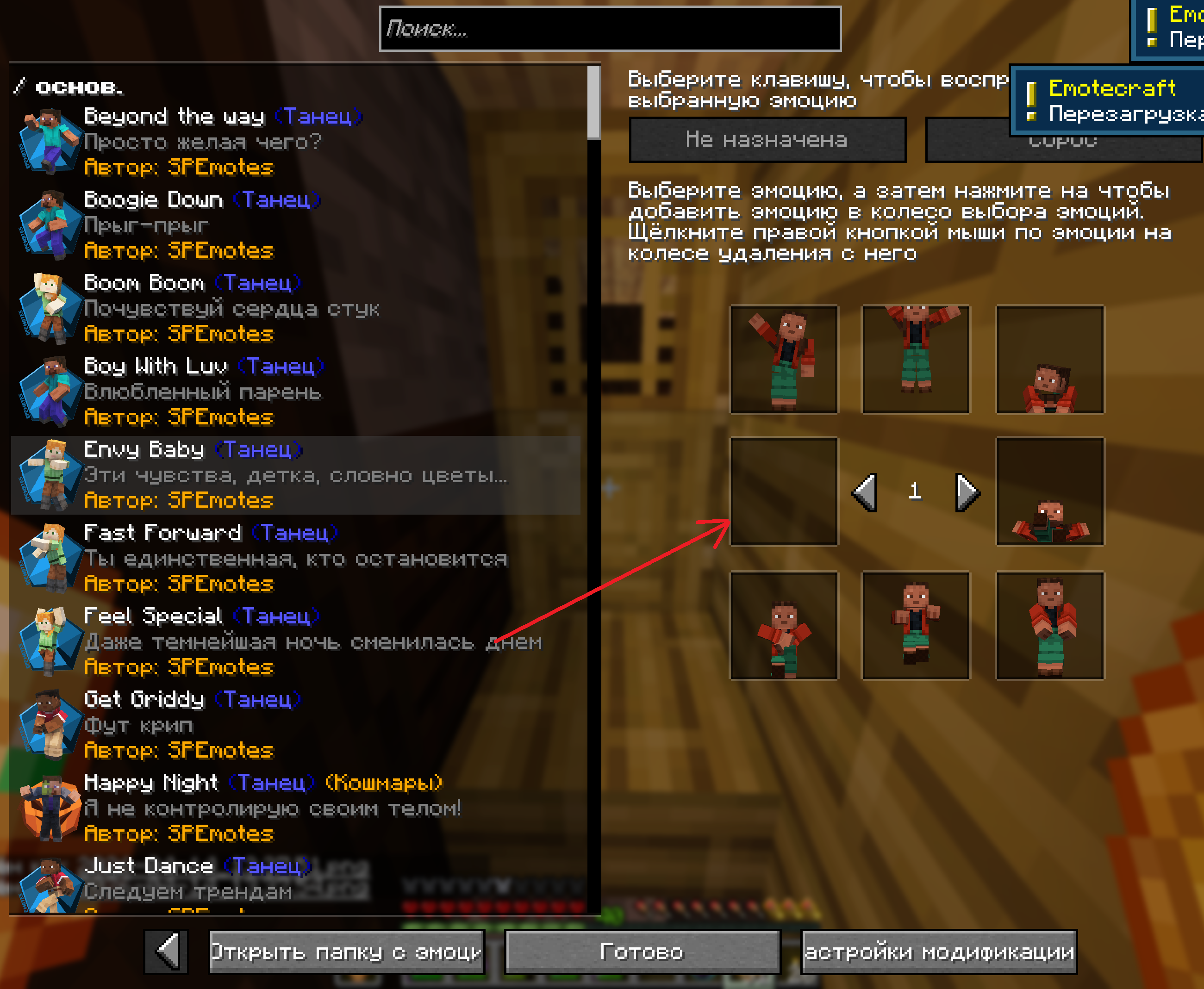 - Конфликты клавиш? Зайдите в Настройки → Управление → найдите EmoteCraft и переназначьте кнопки.