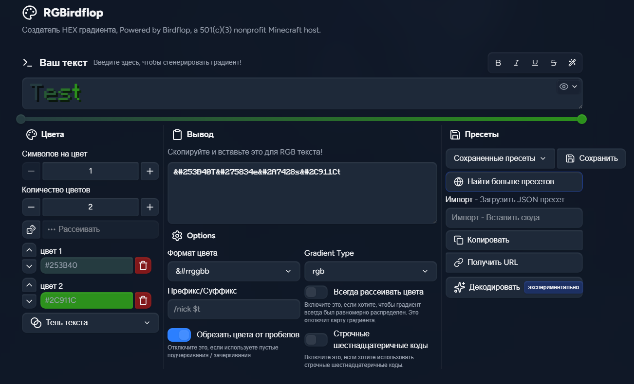 С помощью удобного меню вы без труда сможете настроить красивый переход. На выходе останется только скопировать текст в окне "Вывод" и вставить его в игру!"